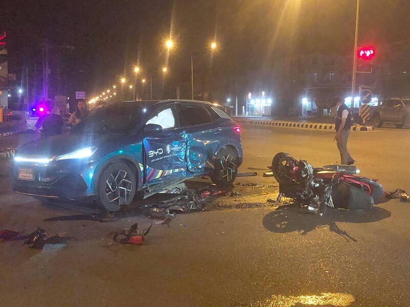 ทำให้รถจักรยานยนต์ชนเข้ากลางรถยนต์ไฟฟ้าอย่างจังจนรถจักรยานยนต์พังเสียหาย ส่วนรถยนต์ไฟฟ้าได้รับความเสียหายบริเวณประตูหน้าฝั่งซ้าย ทำให้ผู้ขับขี่รถจักรยานยนต์ได้รับบาดเจ็บสาหัส อาสามูลนิธิร่มโพธิ์เพชรบูรณ์ได้นำตัวส่งโรงพยาบาล แต่เสียชีวิตในเวลาต่อมา โดยเหตุการณ์ดังกล่าวเกิดขึ้นเวลา 01.59 น. วันที่ 21 เม.ย. 2567
