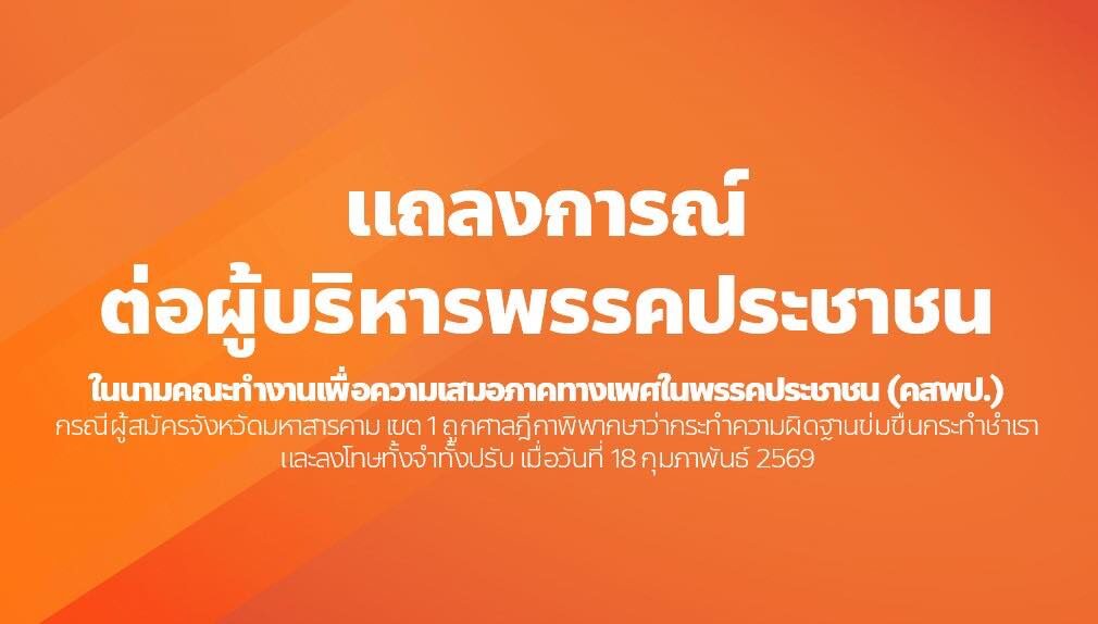 คณะทำงานเพื่อความเสมอภาคทางเพศในพรรคประชาชน (คสพป.) ขอแสดงจุดยืนต่อกรณีผู้สมัครของพรรคในจังหวัดมหาสารคามที่ปรากฏข้อกล่าวหาเกี่ยวกับคดีข่มขืนกระทำชำเรา ซึ่งเป็นประเด็นที่ส่งผลกระทบอย่างร้ายแรงต่อความเชื่อมั่นของสาธารณชน และต่อหลักการความเสมอภาคทางเพศที่พรรคยึดมั่นมาโดยตลอด