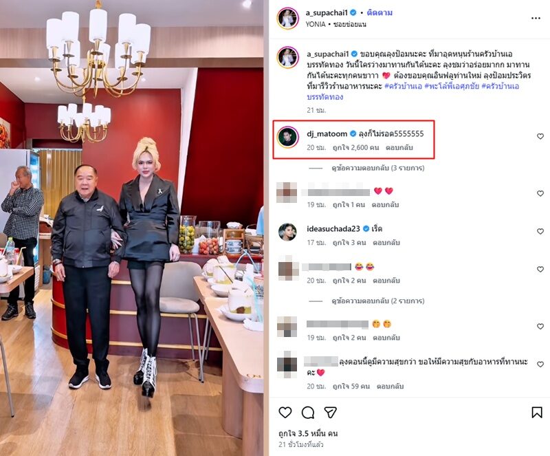 พร้อมทั้งแคปชั่น “ขอบคุณลุงป้อมนะคะ ที่มาอุดหนุนร้านครัวบ้านเอบรรทัดทอง วันนี้ใครว่างมาทานกันได้นะคะ ลุงชมว่าอร่อยมากก มาทานกันได้นะคะทุกคนขาาาต้องขอบคุณอินฟลูท่านใหม่ ลุงป้อมประวิตร ที่มารีวิวร้านอาหารนะคะ #ครัวบ้านเอ #พะโล้พี่เอศุภชัย #ครัวบ้านเอบรรทัดทอง”