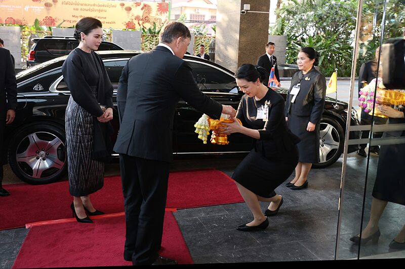 โดยมีน.ส.จิรัสยา พีรานนท์ อัครราชทูต สถานเอกอัครราชทูต ณ เวียงจันทน์ พร้อมด้วยข้าราชการสถานเอกอัครราชทูต ฯ นายปัฐม์ ปัทมจิตร กงสุลใหญ่ ณ แขวงสะหวันนะเขต และภริยา ชุมชนคนไทยในสาธารณรัฐประชาธิปไตยประชาชนลาว นายรัฐวุฒิ เวชประสิทธิ์ รักษาการผู้จัดการทั่วไปโรงแรมคราวน์พลาซ่า เวียงจันทน์ และเจ้าหน้าที่ฯ เฝ้าทูลละอองธุลีพระบาทรับเสด็จ