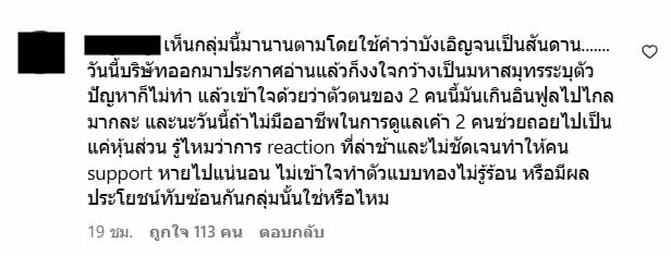 “เห็นกลุ่มนี้มานานตามโดยใช้คำว่าบังเอิญจนเป็นสันดาน……. วันนี้บริษัทออกมาประกาศอ่านแล้วก็งง ใจกว้างเป็นมหาสมุทรระบุตัวปัญหาก็ไม่ทำ แล้วเข้าใจด้วยว่าตัวตนของ 2 คนนี้มันเกินอินฟูลไปไกลมากละ และวันนี้ถ้าไม่มืออาชีพในการดูแลเค้า 2 คนช่วยถอยไปเป็นแค่หุ้นส่วน รู้ไหมว่าการ reaction ที่ล่าช้าและไม่ชัดเจนทำให้คน support หายไปแน่นอน ไม่เข้าใจทำตัวแบบทองไม่รู้ร้อน หรือมีผลประโยชน์ทับซ้อนกันกลุ่มนั้นใช่หรือไหม”