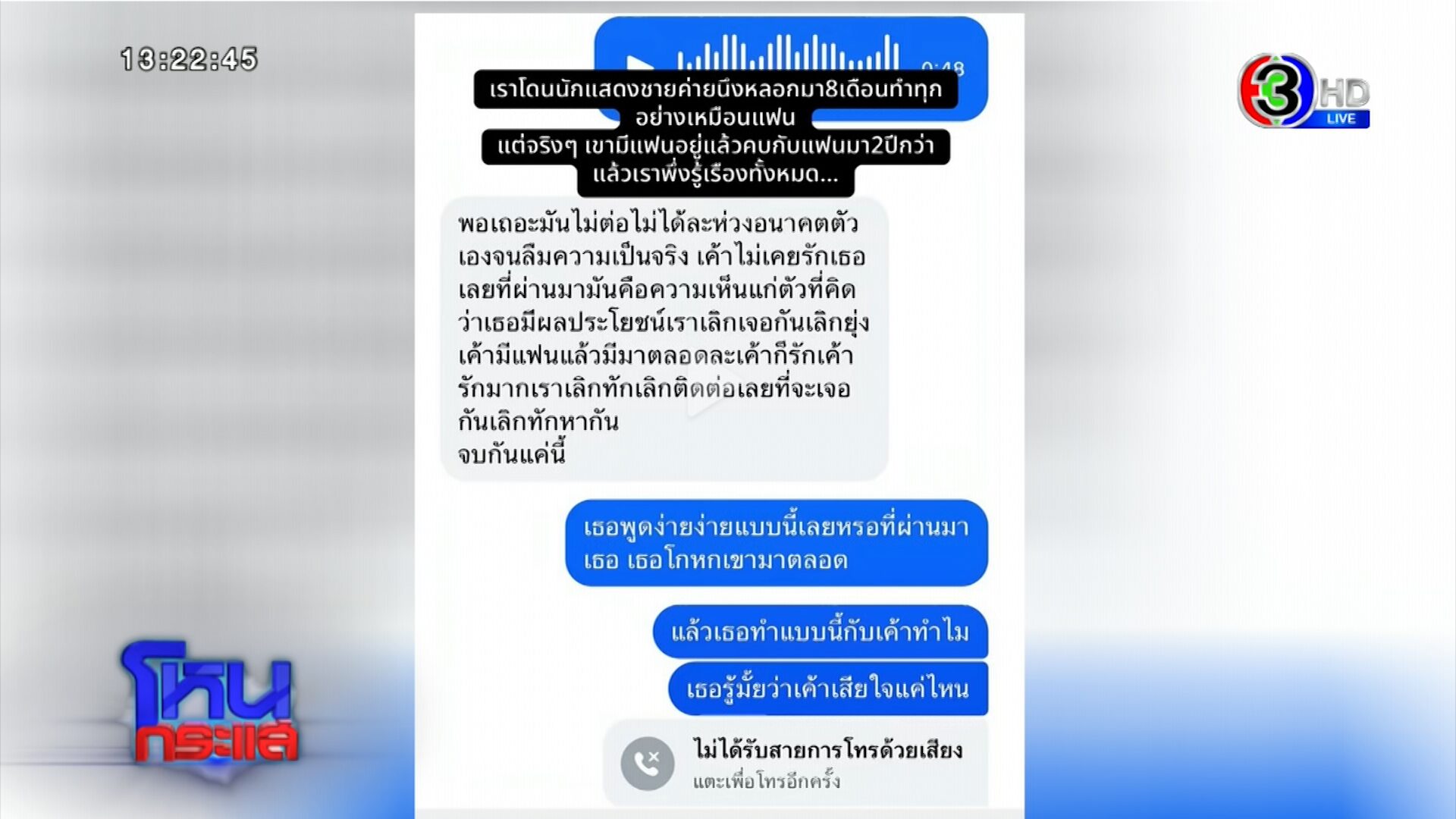 เอ : เราบอกว่าเราคุยกับผู้ชายคนนี้เหมือนกัน คุยกัน 8 เดือนแล้ว เขาอ่านแต่ไม่ตอบ อาจตกใจ อาจไม่เชื่อว่าเป็นเรื่องจริง เขาบอกคนนี้แฟนเรา คุยกันตั้งแต่ปี 66 ของหนูคุย 67 เขาบอกขอดูหลักฐานหน่อยได้มั้ย เขาเหมือนไม่เชื่อเรา เราก็ส่งหลักฐานการคุย รูปเขาเวลาอยู่กับเรา เราเคยแอบถ่ายเขา ช่วงกินข้าว หรือเล่นฟิตเนส แต่เขาไม่เคยถ่ายรูปคู่กับเรา เราถ่ายเหมือนโมเมนต์แอบถ่าย