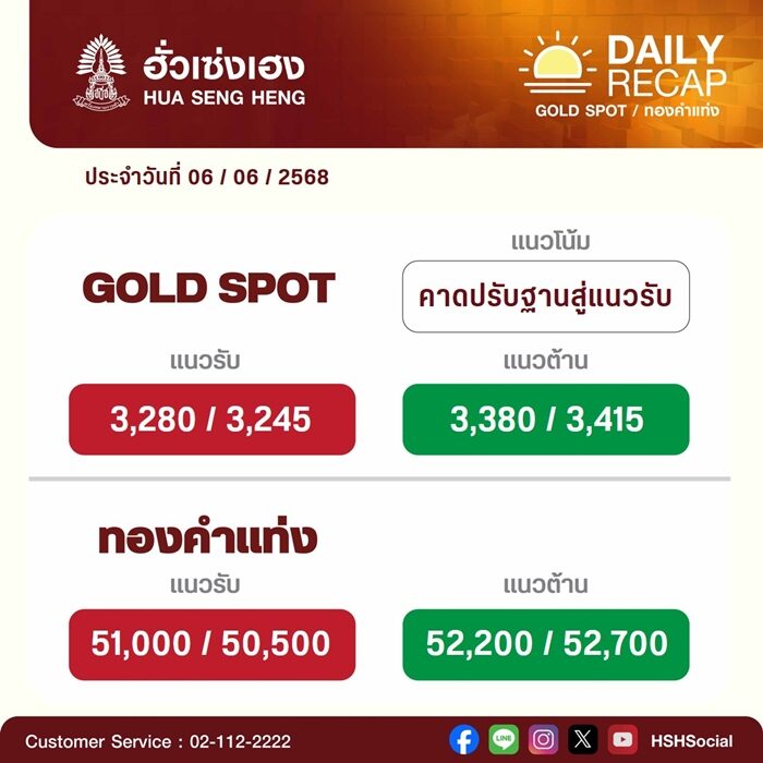 ฮั่วเซ่งเฮง รายงานแนวโน้มราคาทองคำ (เช้า) ประจำวันที่ 6 มิถุนายน 2568 ราคาทองโลกปรับตัวลง (-19.97) ดอลลาร์ เนื่องจากประธานาธิบดีโดนัลด์ ทรัมป์ ผู้นำสหรัฐ โพสต์ข้อความลงใน Truth Social ระบุว่า การสนทนาทางโทรศัพท์กับประธานาธิบดีสี จิ้นผิง ผู้นำจีนเมื่อวานนี้ โดยการสนทนาดังกล่าวเป็นไปด้วยดี