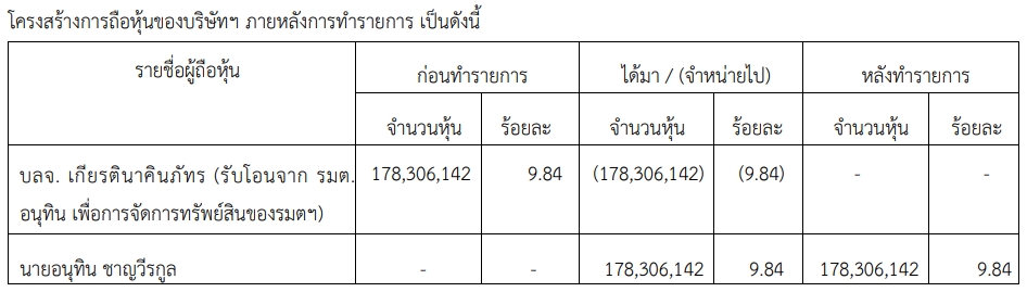ทั้งนี้บริษัทขอแจ้งให้ทราบว่ามีการเปลี่ยนแปลงโครงสร้างผู้ถือหุ้นรายใหญ่ดังกล่าวข้างต้น ไม่มีผลกระทบต่อการเปลี่ยนแปลงอำนาจกรรมการ การบริหารงาน โครงสร้างการจัดการ และอำนาจตัดสินใจในการดำเนินธุรกิจบริษัทแต่อย่างใด