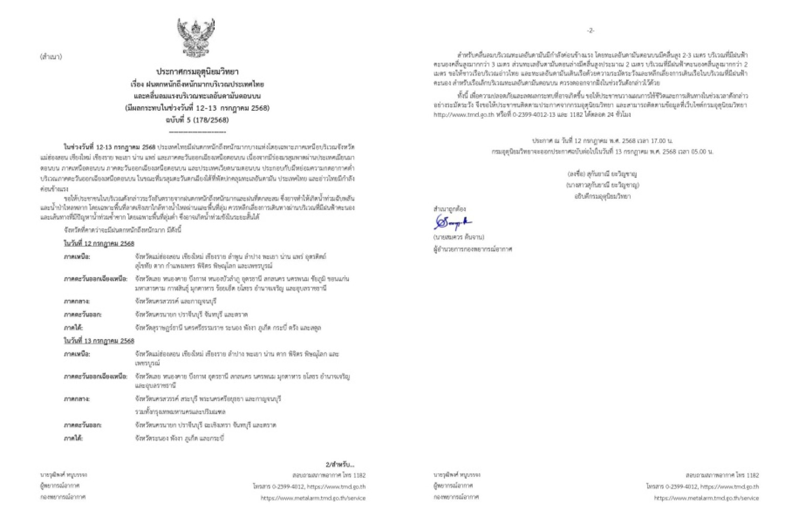 วันที่ 12 ก.ค.68 กรมอุตุนิยมวิทยา ประกาศเรื่อง ฝนตกหนักถึงหนักมากบริเวณประเทศไทย และคลื่นลมแรงบริเวณทะเลอันดามันตอนบน (มีผลกระทบในช่วงวันที่ 12-13 กรกฎาคม 2568) ฉบับที่ 5 (178/2568)