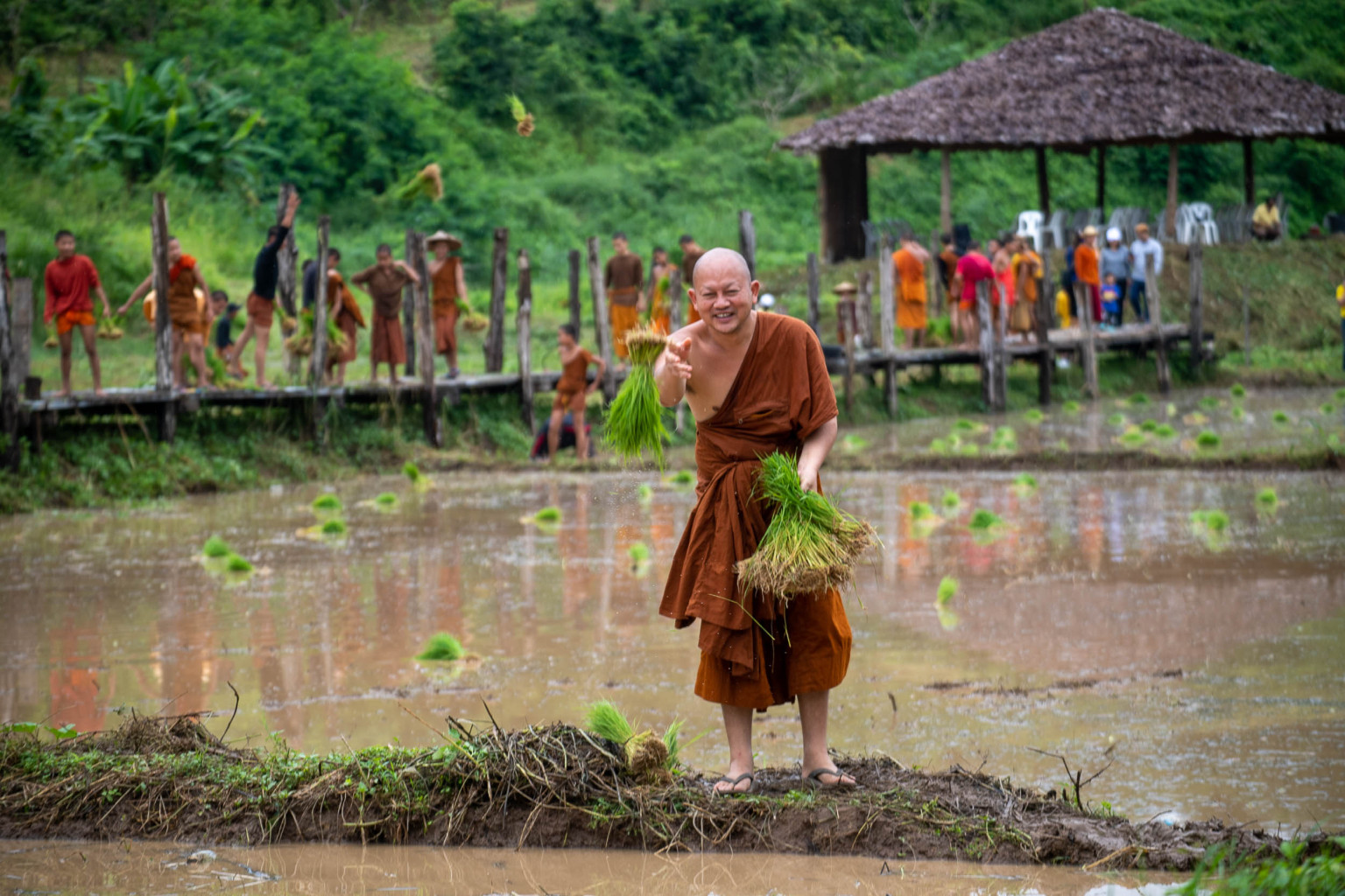 เจ้าอธิการจิตตพัฒน์ อคฺคปญฺโญ เจ้าคณะตำบลจองคำ เขต 2 เจ้าอาวาสวัดภูสมณาราม นำพุทธศาสนิกชน จัดกิจกรรม ลงแขก ดำนา ปล่อยปลา เพื่อเฉลิมพระเกียรติฯ 28 กรกฏาคม 2568