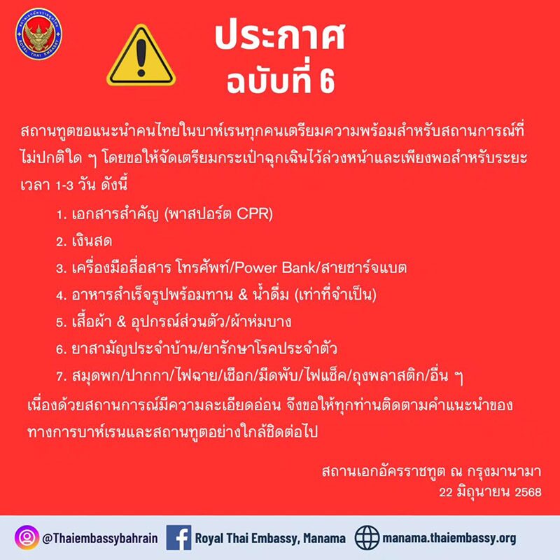 ด่วน! สถานทูต แจ้งคนไทยในบาห์เรน เตรียมกระเป๋าฉุกเฉินล่วงหน้า ให้เพียงพอช่วง 1-3 วัน หลังเหตุสหรัฐอเมริกาโจมตีฐานทัพนิวเคลียร์ในประเทศอิหร่าน