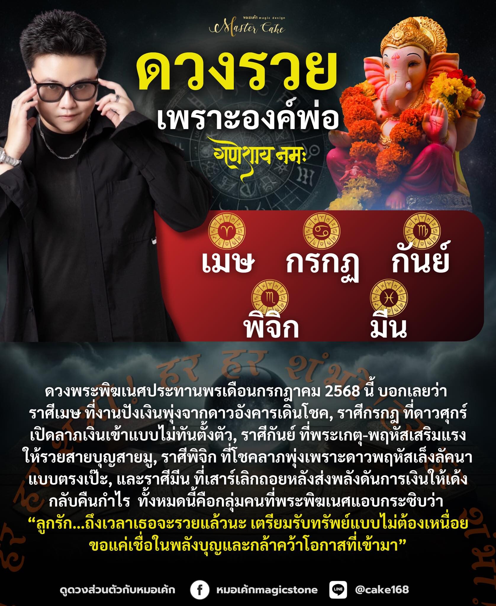 หมอเค้กMagic stone เผยถึงดวงชะตาราศี ดวงรวย เพราะองค์พ่อ ดวงพระพิฆเนศประทานพรเดือนก.ค.2568 บอกเลยว่างานปังเงินพุ่งจากดาวอังคารเดินโชค รวมถึงดาวศุกร์เปิดลาภเงินเข้าแบบไม่ทันตั้งตัว รวมถึงพระเกตุและพฤหัสเสริมแรงให้รวยสายบุญสายมู โชคลาภพุ่ง เพราะดาวพฤหัสเล็งลัคนาแบบตรงเป๊ะ ส่งพลังดันการเงินให้เด้งกลับคืนกำไร ทั้งหมดนี้คือกลุ่มคนที่พระพิฆเนศประทานพร