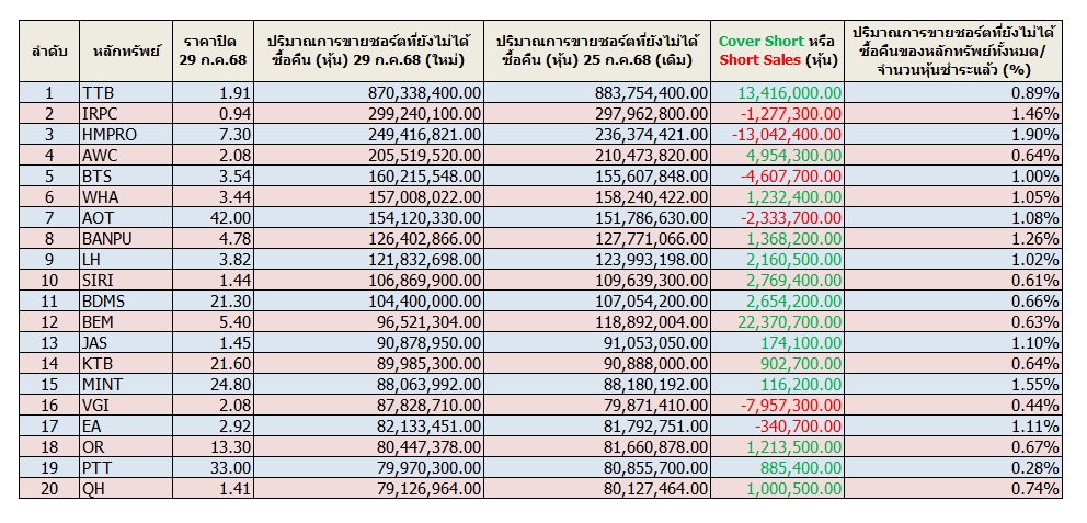 เปิด 20 อันดับหุ้นถูก “Cover-Short” สูงสุด ณ 29 ก.ค.68