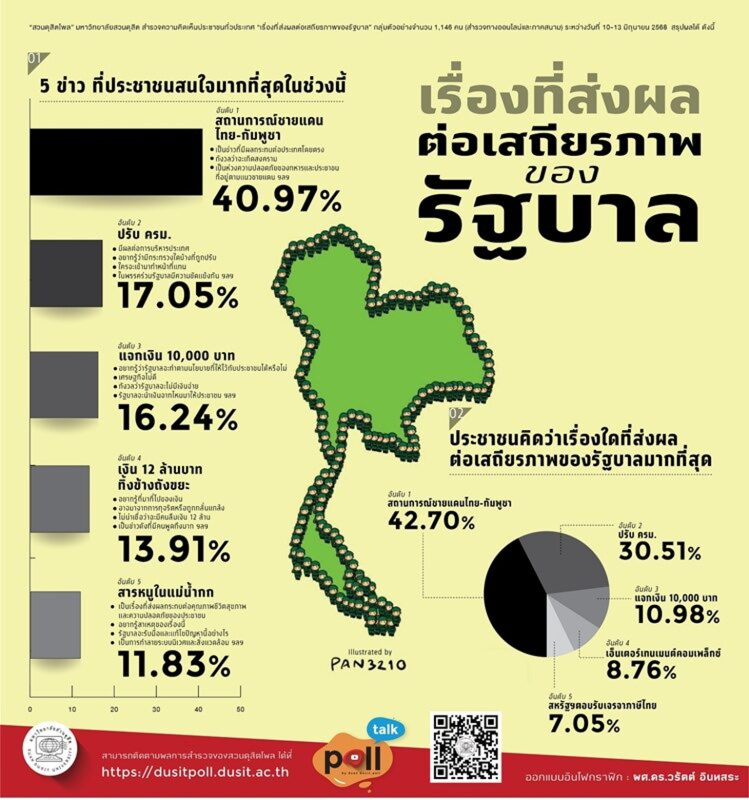 เมื่อวันที่ 15 มิ.ย.68 “สวนดุสิตโพล” มหาวิทยาลัยสวนดุสิต สำรวจความคิดเห็นประชาชนทั่วประเทศ “เรื่องที่ส่งผลต่อเสถียรภาพของรัฐบาล” กลุ่มตัวอย่างจำนวน 1,146 คน (สำรวจทางออนไลน์และภาคสนาม) ระหว่างวันที่ 10-13 มิ.ย.2568 พบว่า ข่าวที่คนสนใจมากที่สุดในช่วงนี้ คือ สถานการณ์ชายแดนไทย-กัมพูชา ร้อยละ 40.97 เนื่องจากเป็นข่าวที่มีผลกระทบต่อประเทศโดยตรง กังวลว่าจะเกิดสงคราม เป็นห่วงความปลอดภัยของทหารและประชาชนที่อยู่ตามแนวชายแดน ฯลฯ รองลงมา คือเรื่องการปรับคณะรัฐมนตรี (ครม.) ร้อยละ 17.05