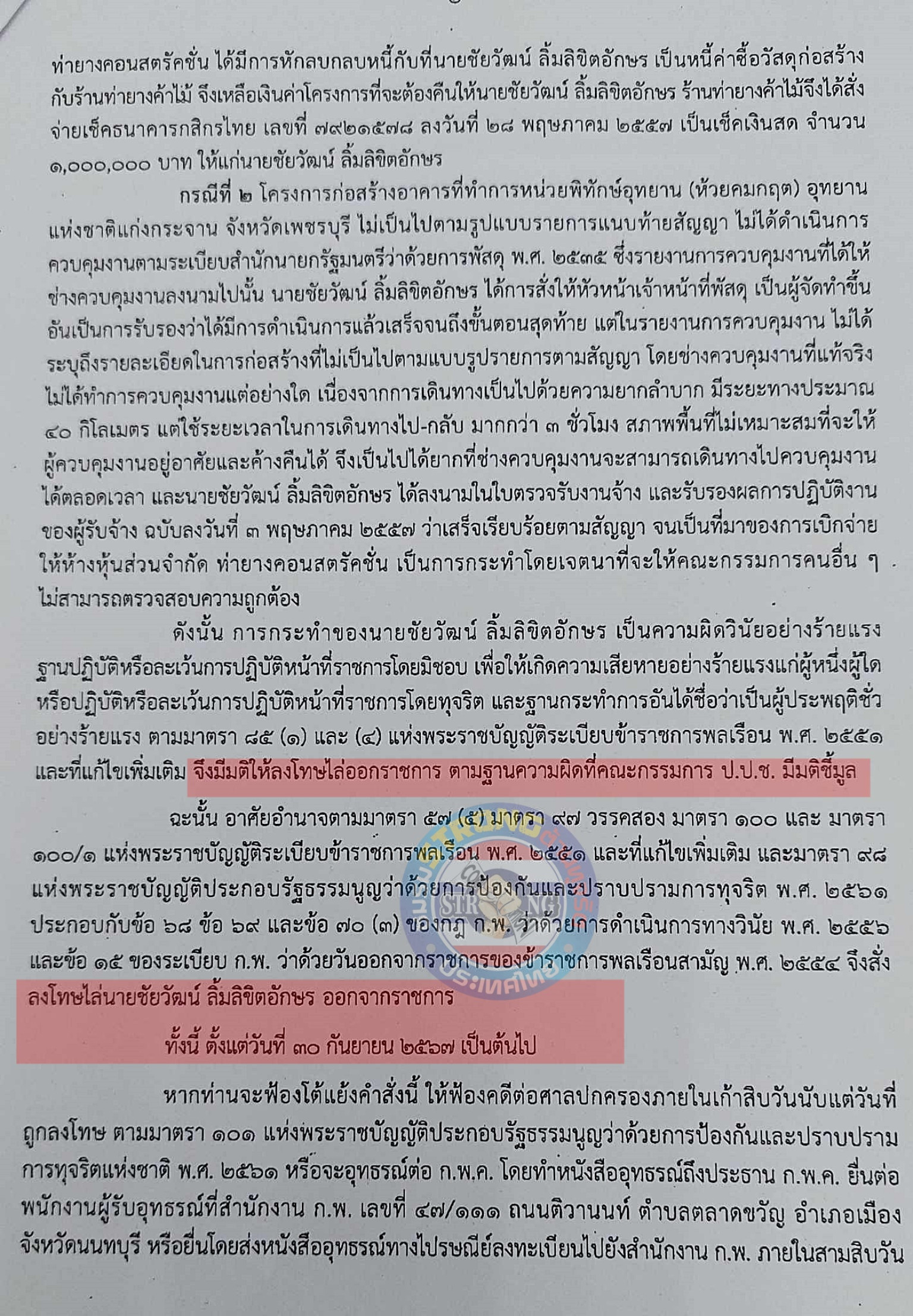 วันที่ ๓๐ พฤษภาคม ๒๕๖๘ ได้พิจารณาแล้วเห็นว่า ตามที่คณะกรรมการ ป.ป.ช. มีคำวินิจฉัยว่านายชัยวัฒน์ ลิ้มลิขิตอักษร ได้กระทำความผิดทางวินัยอย่างร้ายแรง เมื่อครั้งดำรงตำแหน่งหัวหน้าอุทยานแห่งชาติแก่งกระจาน จังหวัดเพชรบุรี ตามสำนวนรายงานการไต่สวนของคณะกรรมการ ป.ป.ช. ดังนี้