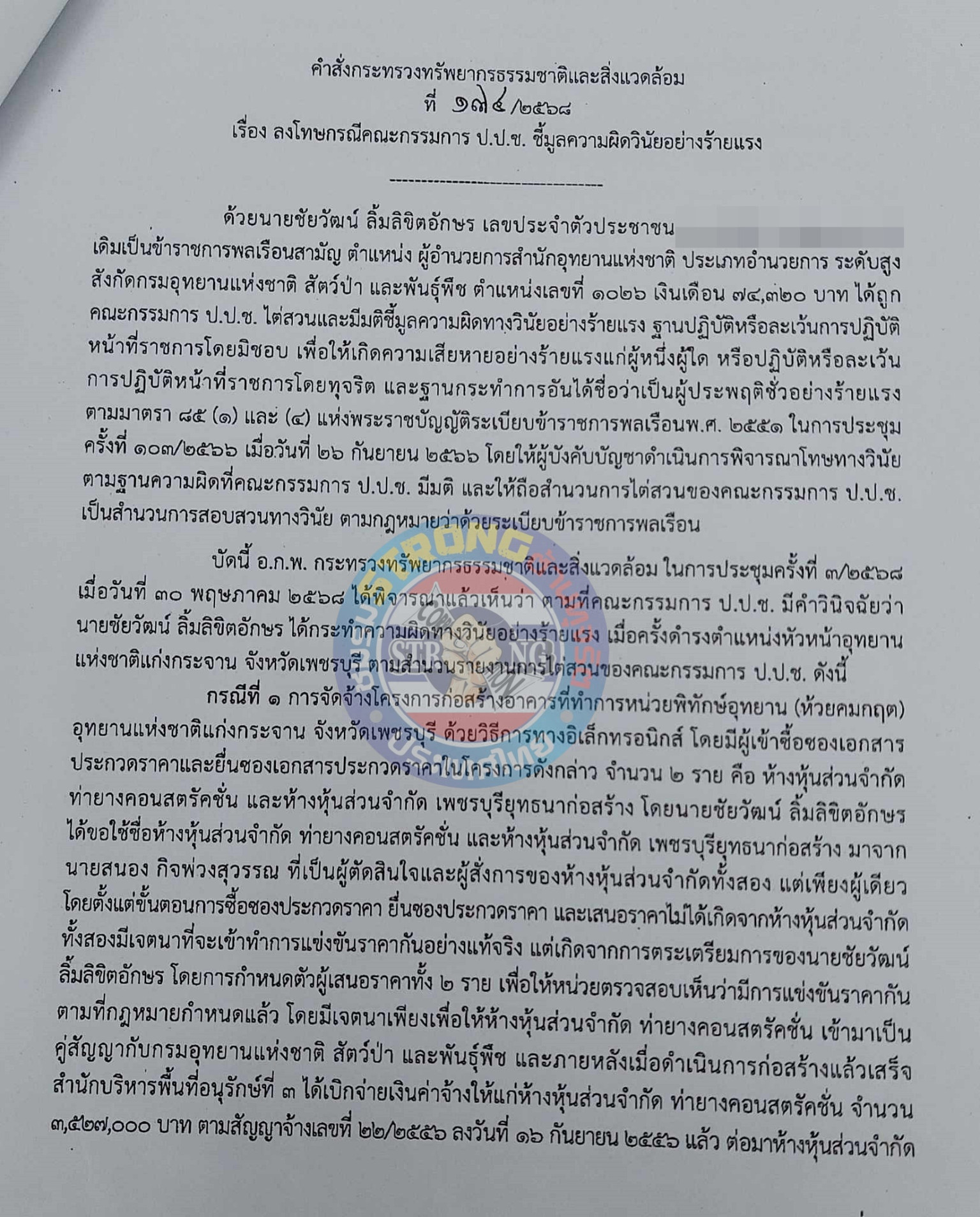 ด่วน! ไล่ออก "ชัยวัฒน์ ลิ้มลิขิตอักษร" ปมฮั้วประมูลก่อสร้างอาคารหน่วยพิทักษ์อุทยานแก่งกระจาน