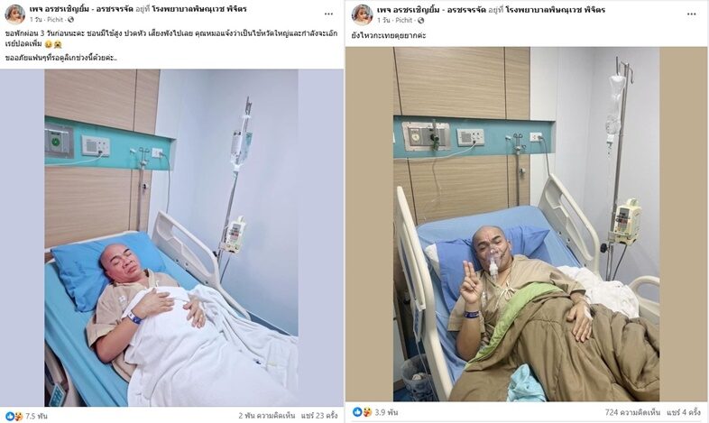 เพจ อรชรเชิญยิ้ม - อรชรจรจัด เผยภาพตลกดัง อรชร เชิญยิ้ม แอดมิตที่โรงพยาบาลพิษณุเวช พิจิตร พร้อมเผยอาการป่วยว่า