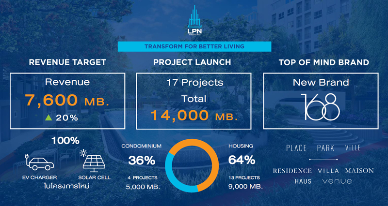 เป้าหมายยอดขายปีนี้ของบริษัทตั้งไว้ที่ 13,000 ล้านบาท และเป้าหมายรายได้ 7,600 ล้านบาท เติบโต 20% จากปีก่อน ขึ้นบันไดอีกขั้นในการไปสู่เป้าระยะ 5 ปีของ LPN