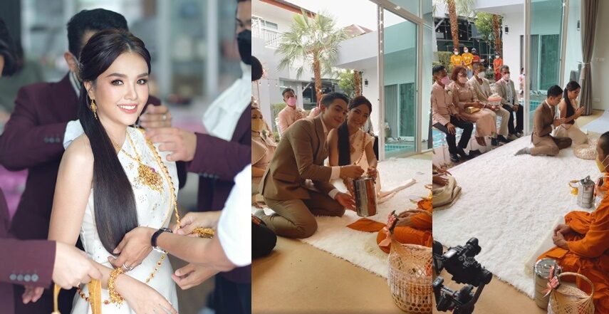 ก่อนเจ้าบ่าวเจ้าสาวควงคู่ในชุดสวยหล่อชุดสูทและชุดไทยประกอบพิธีสงฆ์ทำบุญถวายเพลพระ โดยเจ้าบ่าวคอยประคองดูแลเจ้าสาวอย่างใกล้ชิดตลอดเวลา