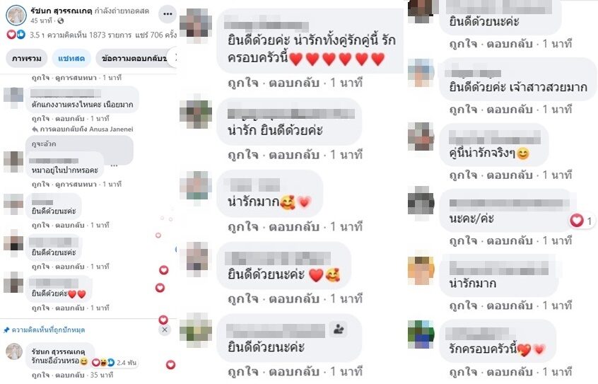 ขณะเฟซบุ๊ก รัชนก สุวรรณเกตุ ไลฟ์สดพิธีการต่างๆ มีแฟนคลับเข้ามาร่วมชมบรรยากาศพิธีแต่งงานและร่วมแสดงความยินดีในไลฟ์สดยอดนับแสนเลยทีเดียว แม้จะมีคอมเมนต์เกรียนหยาบคายบ้างก็โดนถล่มกลับเกิดดราม่ากันประปราย
