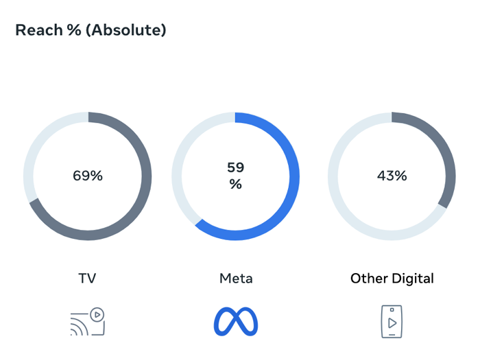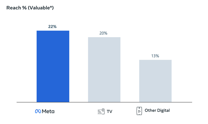 แคมเปญบนแพลตฟอร์มของ Meta มียอดการเข้าถึงหรือ Reach มากถึง 59% โดยมีสัดส่วนใกล้เคียงกับ Reach สูงสุดทางโทรทัศน์ และมากกว่าแพลตฟอร์มดิจิทัลอื่นๆ ที่มีสัดส่วนอยู่ที่ 43%