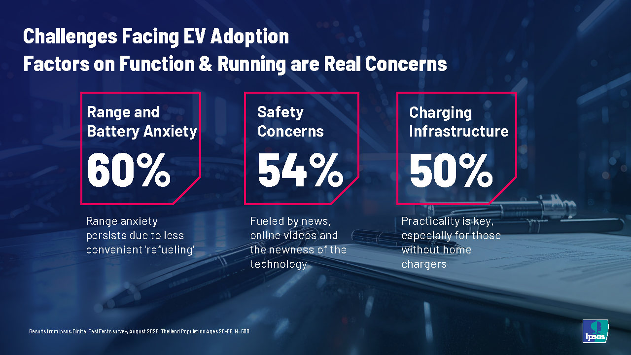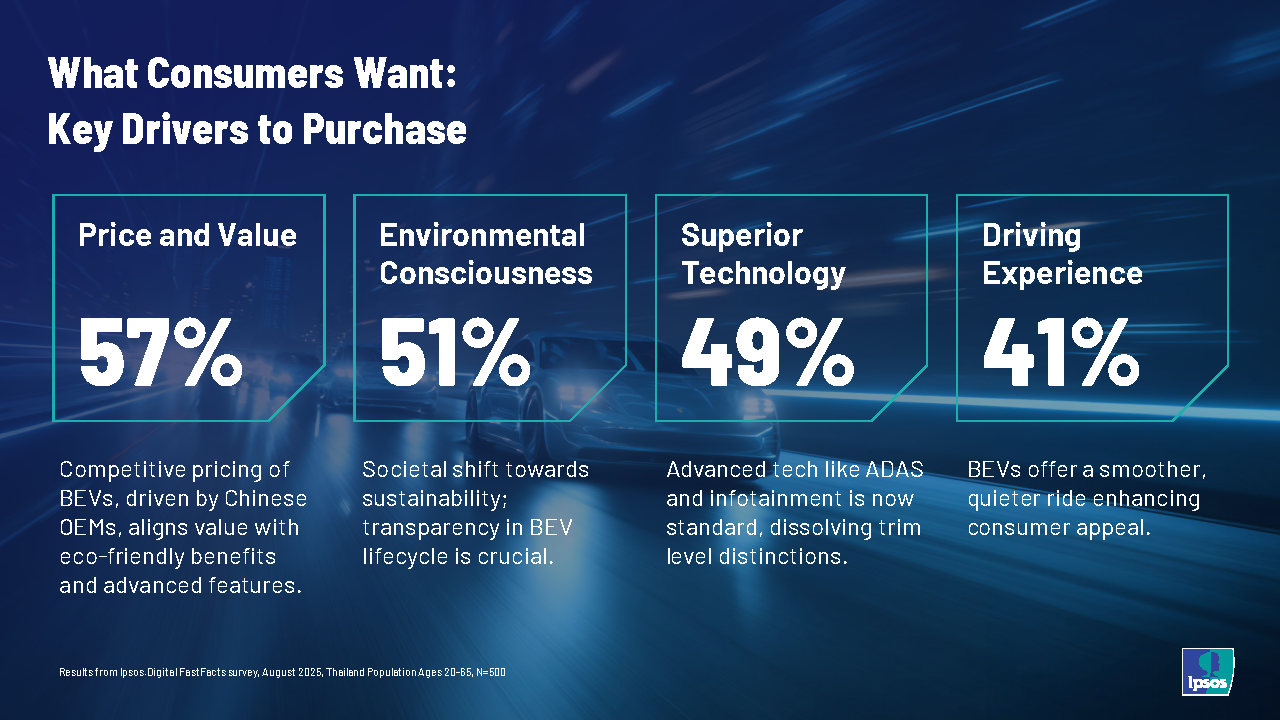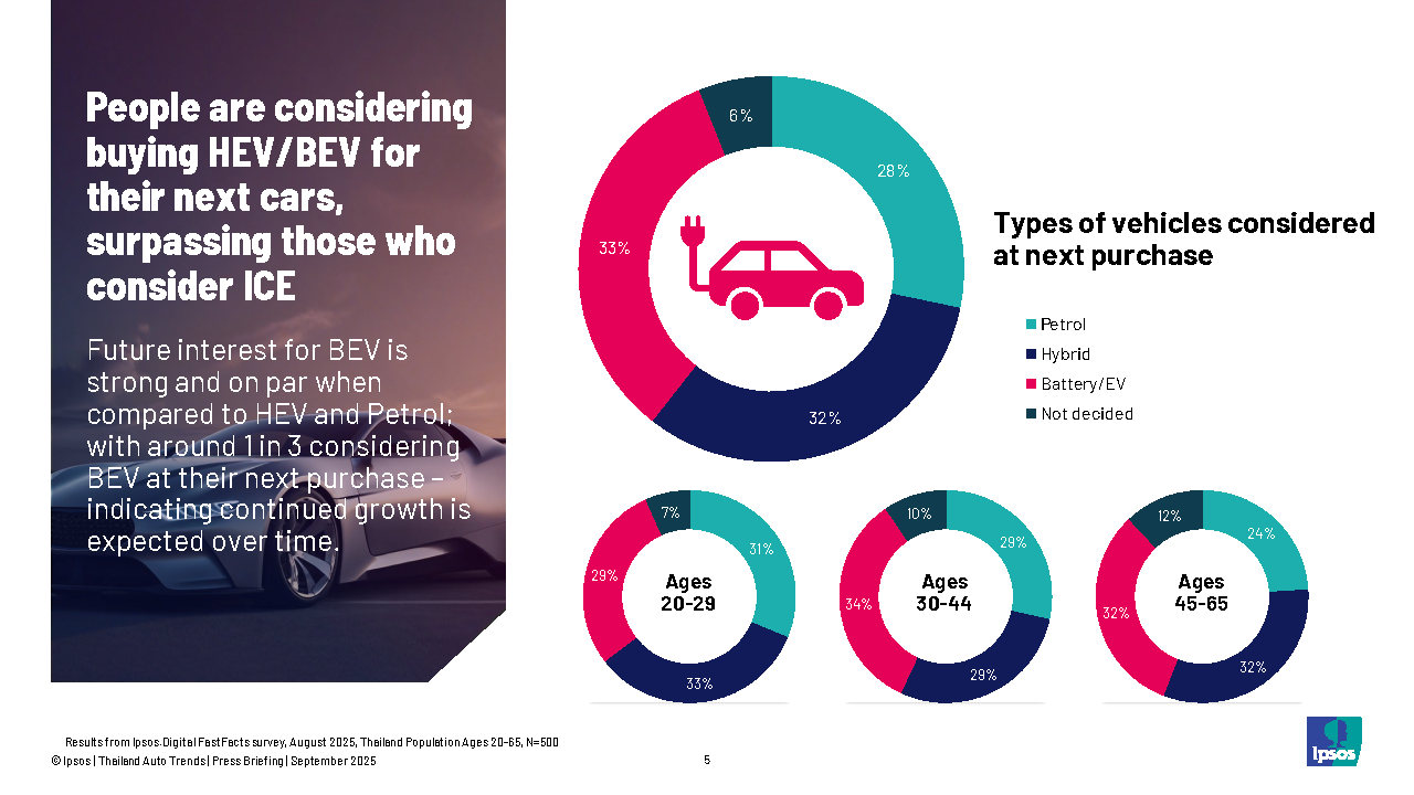 โดย อิปซอสส์ จำกัด (Ipsos Ltd.) บริษัทด้านการวิจัยตลาดและสำรวจความคิดเห็นผู้บริโภค ได้ทำรายงาน Thailand Auto Trend-The Rise of Pure Electric Cars รถไฟฟ้ากับการพลิกโฉมอนาคตยานยนต์ของประเทศ โดยพบว่า จากการมาของรถอีวี ทำให้ผู้บริโภคไทยมีความคิดที่จะ เลือกซื้อรถอีวีมากที่สุด (33%)ตามมาด้วย รถยนต์ไฮบริด (32%)ส่วนความต้องการซื้อ รถยนต์สันดาป (28%) และอีก 6% ยังไม่ตัดสินใจ