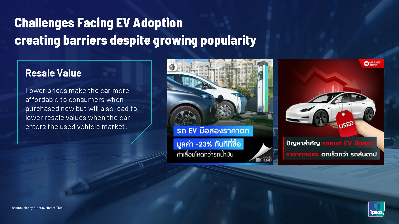 “แม้ว่ารถอีวีในปัจจุบันจะสามารถวิ่งได้ไกลหลายร้อยกิโลเมตรต่อวัน แต่คนก็ยังกังวลมากเป็นอันดับ 1 รวมถึงเรื่องการขายต่อ เป็นอะไรที่คนไทยคิดตั้งแต่ก่อนซื้อรถ ซึ่งมองว่าตอนนี้ตลาดยังใหม่ ทำให้ราคามือ 2 อาจยังไม่นิ่ง”