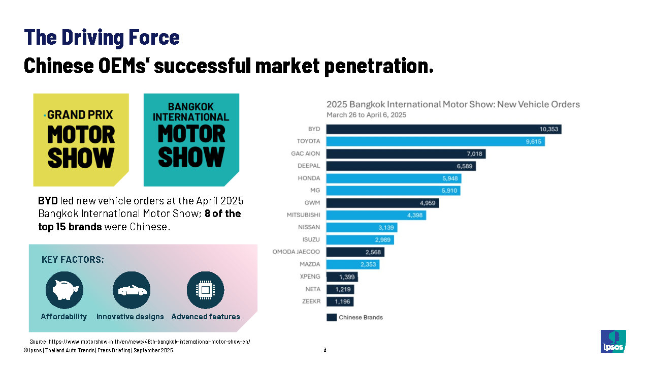 หนึ่งในตัวชี้วัดสำคัญคือ แบรนด์ญี่ปุ่นอย่าง โตโยต้า (Toyota)และ ฮอนด้า (Honda)ที่เคยครองยอดจองอันดับ 1 และ 2 ภายในงาน Bangkok International Motor Show มาโดยตลอด กลับถูก บีวายดี (BYD) ค่ายรถอีวีจากจีน แซงหน้าเป็นที่ 1ในงานครั้งที่ 46 ที่ผ่านมา และแบรนด์ที่มีการจองสูงสุด 15 อันดับแรก เป็นแบรนด์จีนถึง 8 แบรนด์เรียกได้ว่า เกินครึ่ง