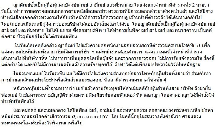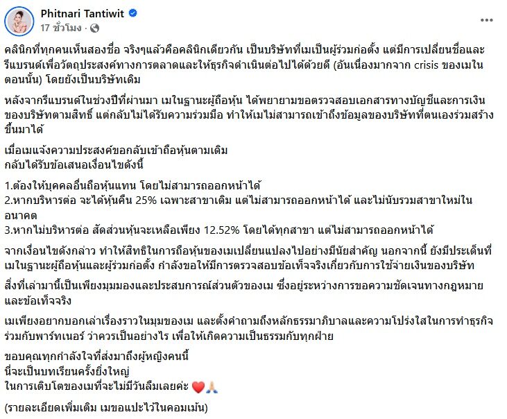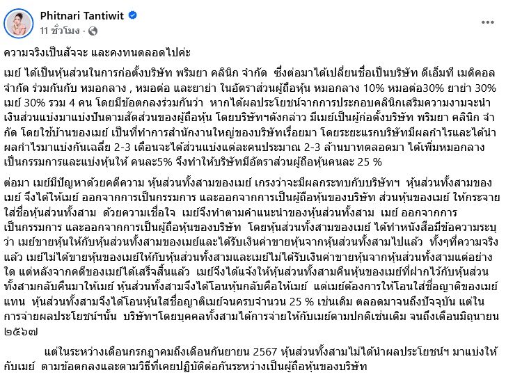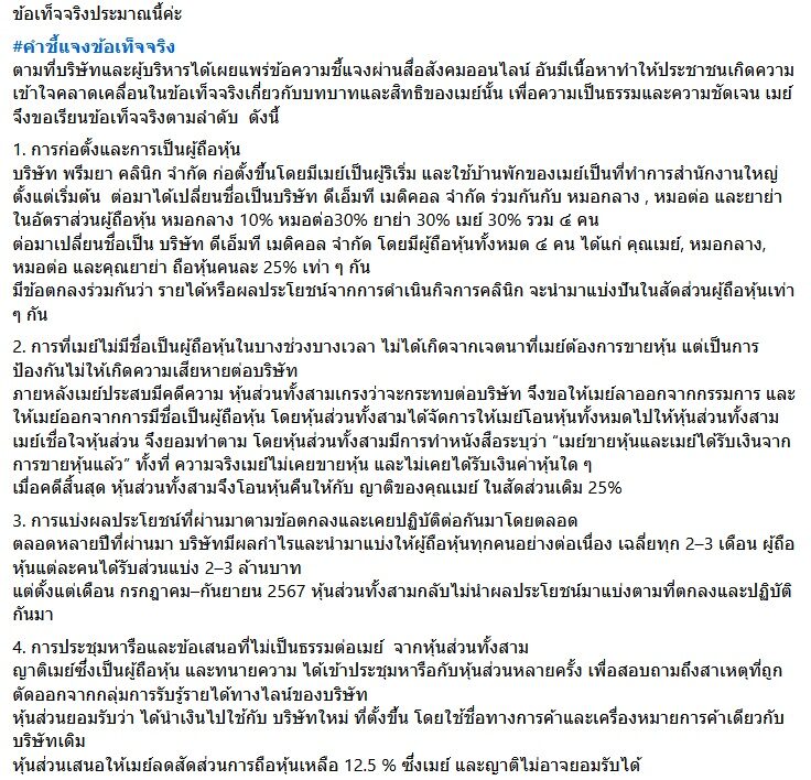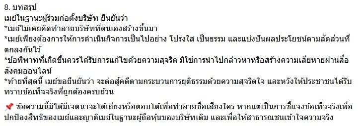 โดย เมย์ ประกาศด้วยว่าขอต่อสู้คดีตามกระบวนการยุติธรรม โพสต์นี้เพื่อชี้แจงข้อเท็จจริง ปกป้องสิทธิของเมย์ และญาติเมย์ที่ถือหุ้น