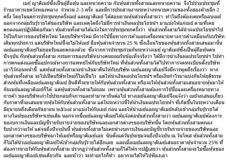 เมย์ บอกด้วยว่า พร้อมจะขายหุ้นที่เหลือให้ หรือหากหุ้นส่วนอยากขายก็พร้อมซื้อคืน แต่หุ้นส่วนทั้งสามไม่ยอม เพราะต้องการใช้ชื่อและเครื่องหมายการค้าเดิม เมย์จึงเสนอราคาหุ้น 25% ที่จะขายให้ และขอให้นำเงินผลประโยชน์ มิ.ย.–ก.ย. 2567 มาแบ่งให้ก่อน และขอกลับเข้ากลุ่มรับรู้รายได้ทางไลน์ของบริษัท พร้อมขอเอกสารงบการเงิน–บัญชี ซึ่งหุ้นส่วนทั้งสามรับปาก แต่จนถึงปัจจุบันยังไม่ได้รับ