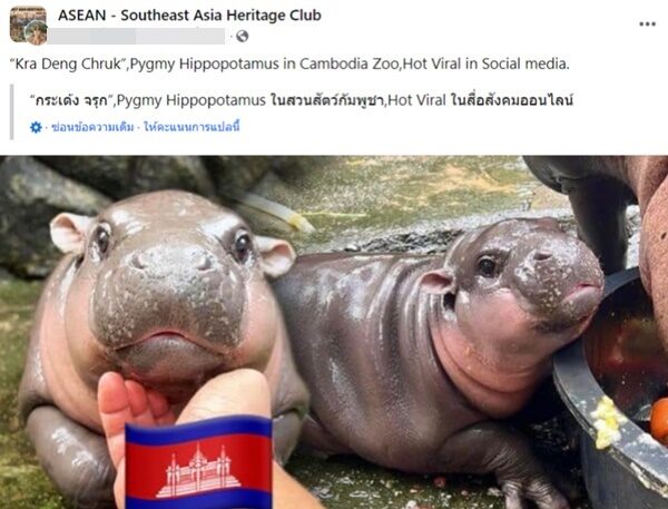 พร้อมนำธงชาติประเทศกัมพูชามาแปะไว้ โดยใส่แคปชัน ภาษาอังกฤษว่า "Kra Deng Chruk, Pygmy Hippopotamus in Cambodia Zoo,Hot Viral in Social"