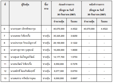 ด้านบริษัท ซีพีที โฮลดิ้ง จำกัด เข้าซื้อหุ้นจำนวน 42,455,000 หุ้น สัดส่วน 4.7172% จากการขายหุ้นของ 1.นางสาวสุภาพร จุงสุพงษ์ จำนวน 16,200,000 หุ้น สัดส่วน 1.8000% ,นายสุเมธ นิมไพบูลย์วัฒน์ จำนวน 14,177,700 หุ้น สัดส่วน 1.5753% ,3.นายสมชาย ทรัพย์มากอุดม จำนวน 6,000,000 หุ้น สัดส่วน 0.6667% และ4.นายสมิทธิ์นิยมกิจสัมฤทธิ์ จำนวน6,077,300 หุ้น สัดส่วน 0.6753%