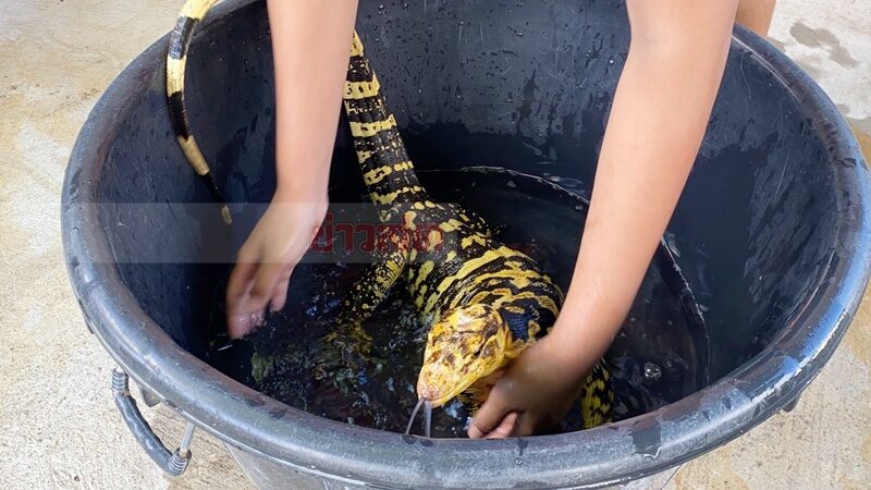 เจอแล้ว " น้องอุตรายันต์ " ตัวมอนิเตอร์ สายพันธุ์ V.cumingi Yellow-headed water monitor สีเหลืองทองคาดดำ สัตว์เลี้ยงแสนรัก ตระกูลตัวเงินตัวทอง หรือ เหี้ย มุดกรงหาบไป 7 วัน ก่อนเพื่อนบ้านเจอโผล่บ่อน้ำ