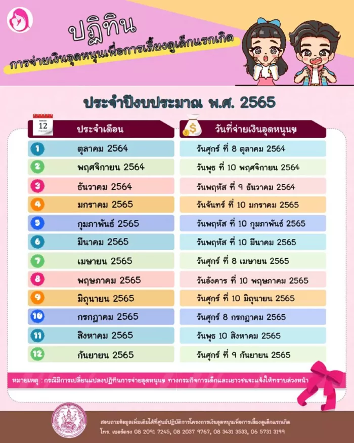 เดือนกันยายน 2565 วันศุกร์ ที่ 9 กันยายน 2565 กรณีมีการเปลี่ยนแปลงปฏิทินการจ่ายอุดหนุนฯ ทางกรมกิจการเด็กและเยาวชน จะแจ้งให้ทราบล่วงหน้าทางเพจ โครงการเงินอุดหนุนเพื่อการเลี้ยงดูเด็กแรกเกิด สามารถติดต่อสอบถามข้อมูลเพิ่มเติมได้ที่ศูนย์ปฏิบัติการโครงการเงินอุดหนุนเพื่อการเลี้ยงดูเด็กแรกเกิด โทรศัพท์หมายเลข 08 2091 7245, 08 2037 9767, 08 3431 3533, 06 5731 3199 (ในวันเวลาราชการ จันทร์ - ศุกร์ ระหว่างเวลา 08.30 - 17.00 น.) ศูนย์ช่วยเหลือสังคม กระทรวง พม. โทร. 1300 ตลอด 24 ชั่วโมง เว็บไซต์กรมกิจการเด็กและเยาวชน http://csgcheck.dcy.go.th/public/eq/popSubsidy.do