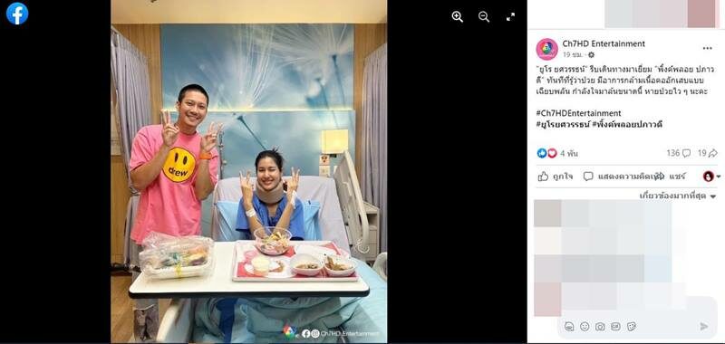 ก่อนที่เพจเฟซบุ๊ก Ch7HD Entertainment จะโพสต์รูปที่พระเอกคู่จิ้น ยูโร ยศวรรธน์ ทะวาปี เดินทางมาเยี่ยมและให้กำลังใจ สาวพิ้งค์พลอย ถึงข้างเตียง พร้อมข้อความว่า “ยูโร ยศวรรธน์ รีบเดินทางมาเยี่ยม พิ้งค์พลอย ปภาวดี ทันทีที่รู้ว่าป่วย มีอาการกล้ามเนื้อคออักเสบแบบเฉียบพลัน กำลังใจมาล้นขนาดนี้ หายป่วยไวๆ นะคะ”