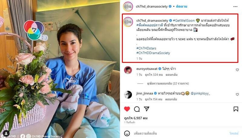 โดยระบุข้อความว่า “#GetWellSoon มาร่วมส่งกำลังใจให้ #พิ้งค์พลอยปภาวดี ที่เข้ารับการรักษาอาการกล้ามเนื้อคออักเสบแบบเฉียบพลัน ขณะนี้พักฟื้นอยู่ที่โรงพยาบาล แอดขอให้พิ้งค์พลอยหายไวๆ นะคะ แฟนๆ ทุกคนเป็นกำลังใจให้ค่า ” ท่ามกลางแฟนๆ ที่เข้ามาให้กำลังนางเอกสาวกันอย่างมากมาย