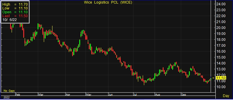 ผู้สื่อข่าวรายงานว่า วันนี้ (6 ต.ค.65) ราคาหุ้น บริษัท ไวส์ โลจิสติกส์ จำกัด (มหาชน) หรือ WICE ณ เวลา 15:59 น. อยู่ที่ระดับ 11.50 บาท บวก 0.50 บาท หรือ 4.55% สูงสุดที่ระดับ 11.70 บาท ต่ำสุดที่ระดับ 11.10 บาท ด้วยมูลค่าการซื้อขาย 47.16 ล้านบาท
