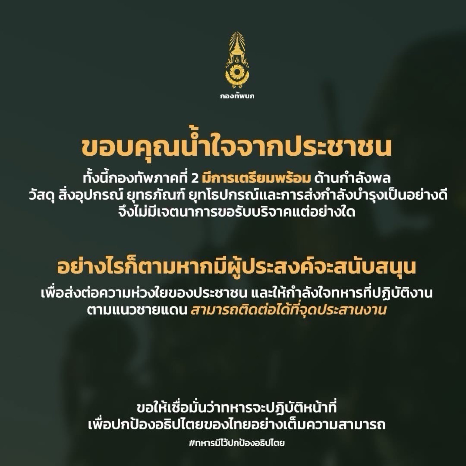 ทบ. เปิดช่องทางการประสานส่งสิ่งของ เป็นกำลังใจให้ทหารในพื้นที่ชายแดน ยืนยันหน่วยทหารไม่ขาดแคลน และไม่มีนโยบายขอรับการบริจาค