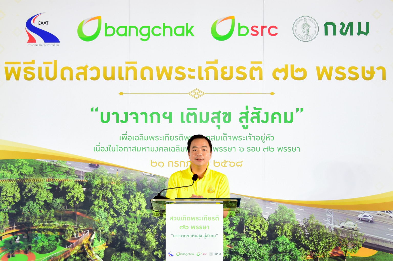 วันที่ 21 กรกฎาคม 2568 ณ บริเวณสวนเทิดพระเกียรติ ริมทางพิเศษเฉลิมมหานคร เลียบทางลงทางด่วน ถนนสุขุมวิท 50 นายสุรเชษฐ์ เหล่าพูลสุข ผู้ว่าการการทางพิเศษแห่งประเทศไทย (กทพ.) กระทรวงคมนาคม ,นายชัชชาติ สิทธิพันธุ์ ผู้ว่าราชการกรุงเทพมหานคร และนายชัยวัฒน์ โควาวิสารัช ประธานเจ้าหน้าที่บริหารกลุ่มบริษัทบางจากและกรรมการผู้จัดการใหญ่ บริษัท บางจาก คอร์ปอเรชั่น จำกัด (มหาชน) ร่วมพิธีเปิดสวนเทิดพระเกียรติ 72 พรรษา บางจากฯ เติมสุข สู่สังคม