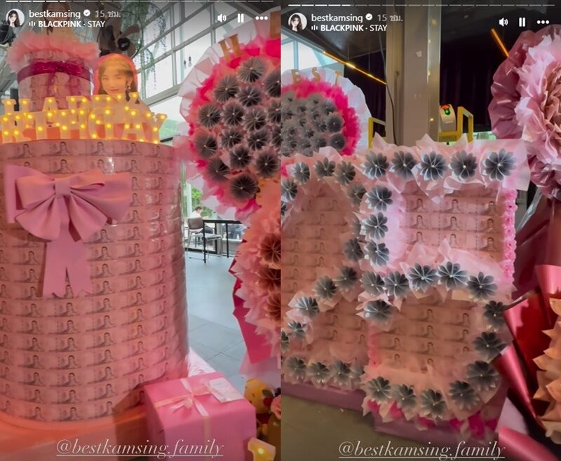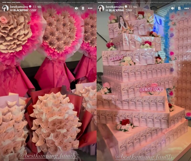 ขณะที่แฟนคลับจัดใหญ่เซอร์ไพรส์วันเกิดให้สาวเบสท์ ของขวัญสุดเปย์เป็นธนบัตรพับเป็นช่อดอกไม้ต่างๆ จัดมาให้แบบชุดใหญ่ สาวเบสท์สุดปลื้มมากๆ
