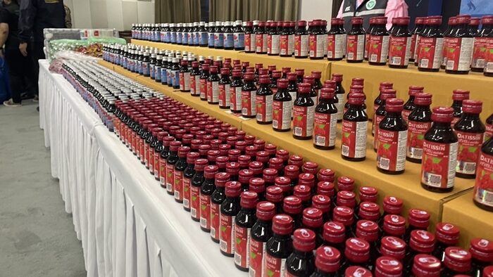 ตรวจยึดวัตถุดิบ ขวดบรรจุภัณฑ์ และอุปกรณ์ในการผลิต ที่ใช้ในการต้มยาแก้ไอ โดยทั้ง 2 จุดดังกล่าวมียอดการผลิตยาแก้ไอ วันละ 20,000 ขวด คิดเป็นมูลค่าวันละประมาณ 1,000,000 บาท โดยทำมาแล้วเป็นเวลา 2 เดือน