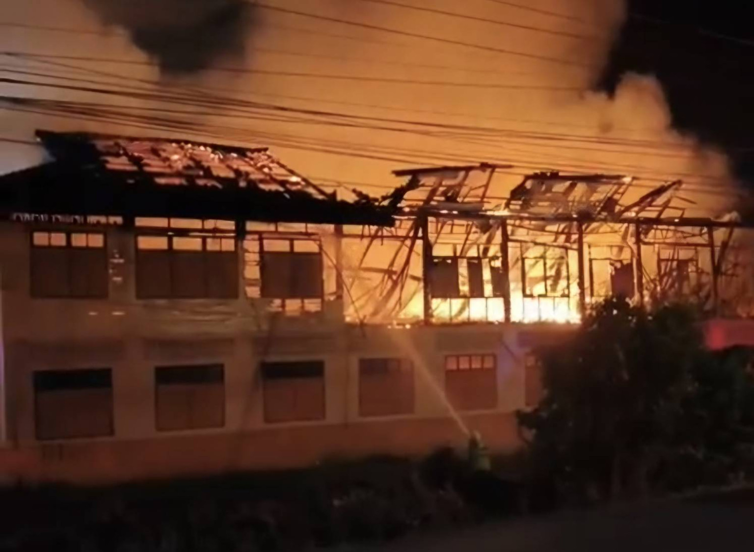 เมื่อไปถึงพบเพลิงกำลังลุกไหม้บริเวณด้านล่างอาคารเรียนฝั่งขวา ซึ่งเป็นอาคารไม้ 2 ชั้น อย่างรุนแรง และลุกลามขึ้นไปบนชั้นสองอย่างรวดเร็ว เนื่องจากเป็นอาคารไม้เก่าแก่อายุกว่า 80 ปี