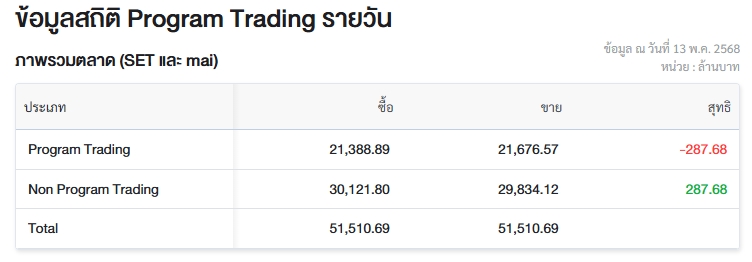 ขณะที่มูลค่าซื้อขายรายวันผ่าน Non Program Trading หรือ “การซื้อขายที่ไม่ใช่โปรแกรม” มีมูลค่าซื้อจำนวน 30,121.80 ล้านบาท และมูลค่าขายจำนวน 29,834.12 ล้านบาท เท่ากับซื้อสุทธิ 287.68 ล้านบาท