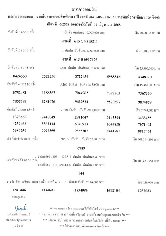 วันที่ 16 มิถุนายน 2568 ธนาคารออมสิน เผยแพร่ ผลการออกเลขสลากจ่ายคืนสลากออมสินพิเศษ 1 ปี งวดที่ 604, 606-616 และ รางวัลเพื่อการศึกษา งวดที่ 603 เดือนที่ 6/2568 ออกรางวัลที่ 16 มิถุนายน 2568