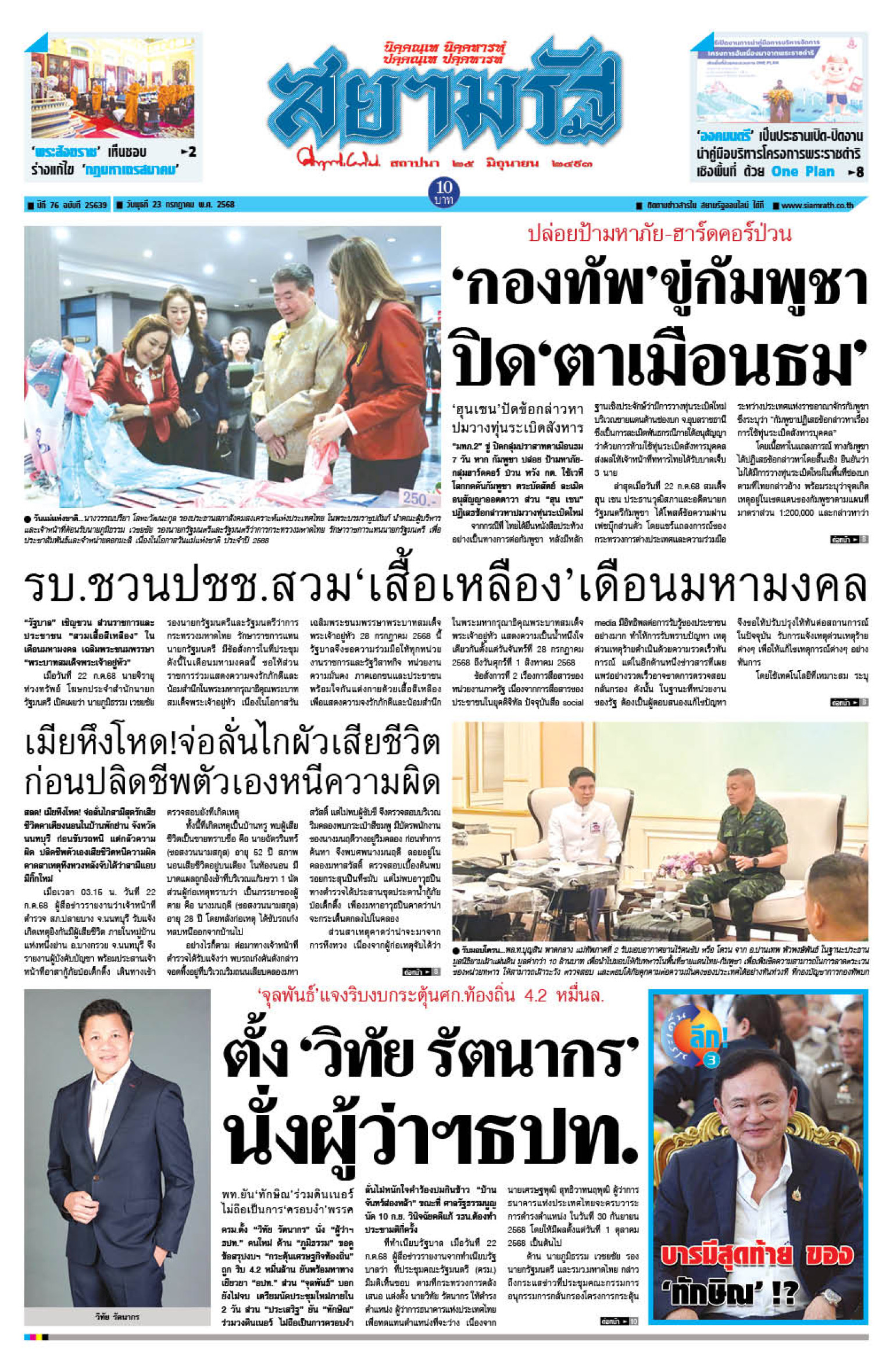 หน้า 1 หนังสือพิมพ์สยามรัฐรายวัน ฉบับวันพุธที่ 23 กรกฎาคม 2568