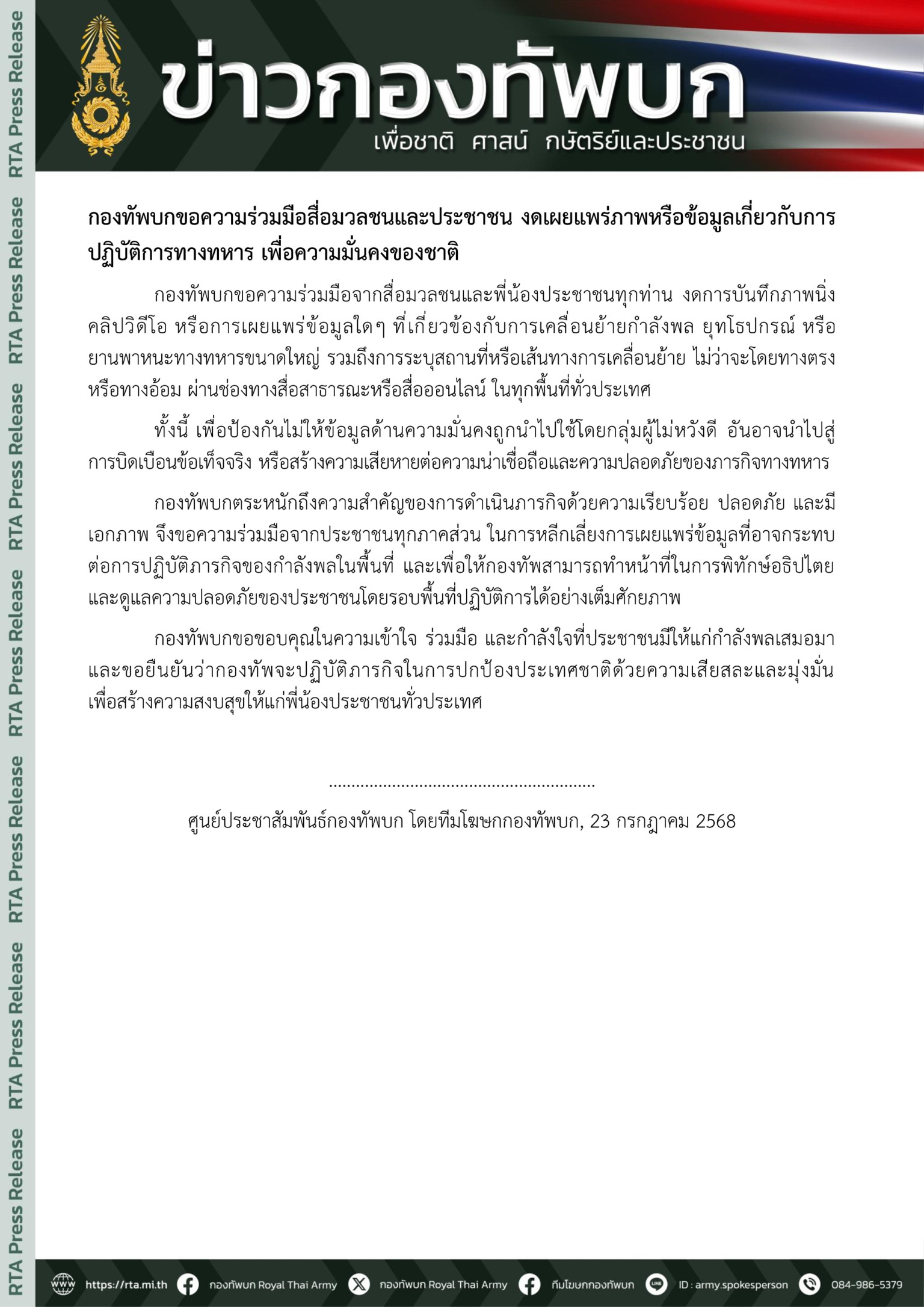 กองทัพบกขอความร่วมมือจากสื่อมวลชนและพี่น้องประชาชนทุกท่าน งดการบันทึกภาพนิ่ง คลิปวิดีโอ หรือการเผยแพร่ข้อมูลใดๆ ที่เกี่ยวข้องกับการเคลื่อนย้ายกำลังพล ยุทโธปกรณ์ หรือยานพาหนะทางทหารขนาดใหญ่ รวมถึงการระบุสถานที่หรือเส้นทางการเคลื่อนย้าย ไม่ว่าจะโดยทางตรงหรือทางอ้อม ผ่านช่องทางสื่อสาธารณะหรือสื่อออนไลน์ ในทุกพื้นที่ทั่วประเทศ