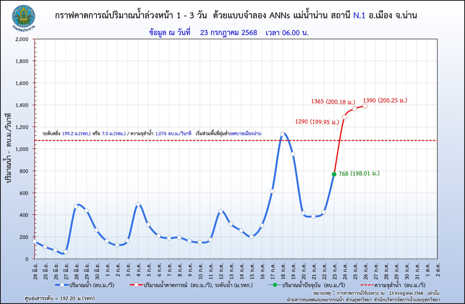 วันที่ 23 ก.ค.68 จากฝนที่ตกหนักในคืนที่ผ่านมา (22 ก.ค.68) ส่งผลให้หลายพื้นที่มีปริมาณฝนสะสมสูงมาก โดยเฉพาะในพื้นที่จังหวัดน่าน พบว่ามีฝนสะสมเกิน 250 มิลลิเมตร (มม.) ในหลายจุด อาทิ ต.พญาแก้ว อ.เชียงกลาง วัดได้สูงสุดถึง 280 มม. ทั้งยังส่งผลให้ระดับน้ำในแม่น้ำสายต่างๆ ในพื้นที่ภาคเหนือ เกิดน้ำล้นตลิ่งและมีแนวโน้มเพิ่มสูงขึ้น ได้แก่