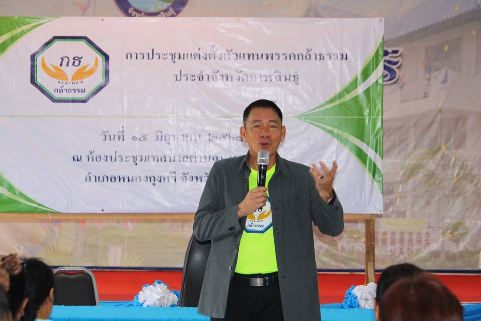 โดยการประชุมครั้งนี้มีวัตถุประสงค์หลักเพื่อสรรหาตัวแทนพรรคประจำจังหวัดกาฬสินธุ์ โดยมี ดร.สังคม ศรีโคตร สมาชิกพรรคกล้าธรรม เป็นประธานในการประชุม และมีคณะกรรมการการเลือกตั้งประจำจังหวัดกาฬสินธุ์เข้าร่วมสังเกตการณ์อย่างใกล้ชิด มีสมาชิกพรรคเข้าร่วมประชุมทั้งสิ้น 60 คน ทั้งนี้ที่ประชุมมีมติเป็นเอกฉันท์ให้นายสมศักดิ์ สายแสน และนางละอองดาว ภูสมยา เป็นตัวแทนพรรคกล้าธรรมประจำจังหวัดกาฬสินธุ์