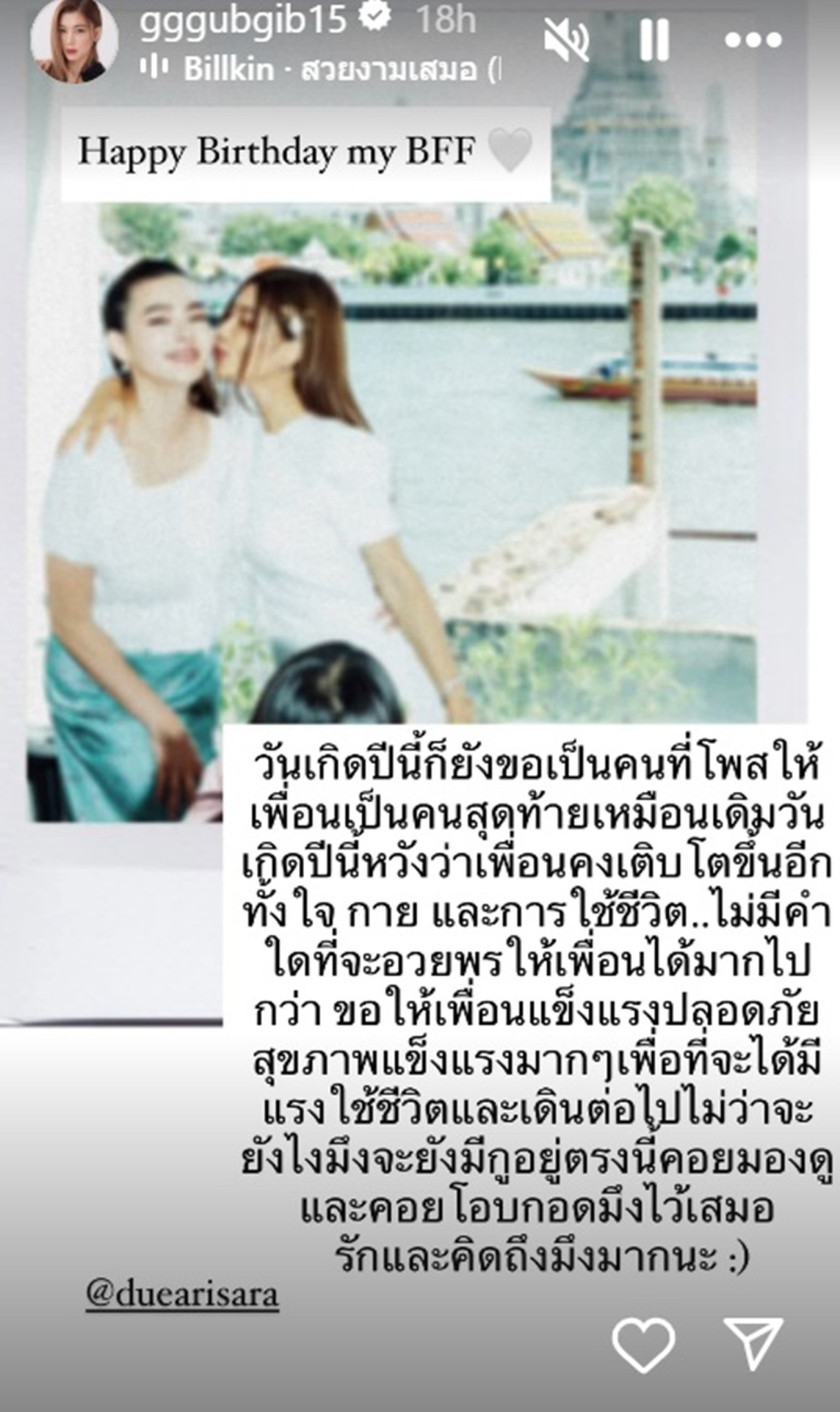เป็นอีกหนึ่งโมเมนต์สุดอบอุ่นที่สะท้อนถึงมิตรภาพแน่นแฟ้นของสองเพื่อนซี้ในวงการบันเทิง “กุ๊บกิ๊บ สุมณทิพย์” และ “ดิว อริสรา” โดยล่าสุดในโอกาสวันคล้ายวันเกิดของสาวดิว เพื่อนรักอย่างกุ๊บกิ๊บก็ไม่พลาดที่จะส่งข้อความซึ้งๆ ผ่านไอจีสตอรี่ @gggubgib15