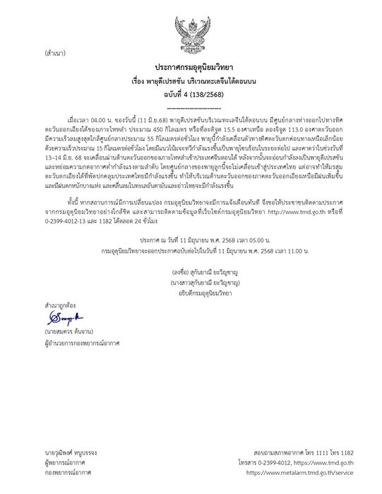 วันที่ 11 มิ.ย.2568 กรมอุตุนิยมวิทยา ประกาศ เรื่อง พายุดีเปรสชัน บริเวณทะเลจีนใต้ตอนบน ฉบับที่ 4 (138/2568) ระบุว่า เมื่อเวลา 04.00 น.ของวันนี้ (11 มิ.ย.68) พายุดีเปรสชันบริเวณทะเลจีนใต้ตอนบน มีศูนย์กลางห่างออกไปทางทิศตะวันออกเฉียงใต้ของเกาะไหหลำ ประมาณ 450 กิโลเมตร หรือที่ละติจูด 15.5 องศาเหนือ ลองจิจูด 113.0 องศาตะวันออก มีความเร็วลมสูงสุดใกล้ศูนย์กลางประมาณ 55 กิโลเมตรต่อชั่วโมง