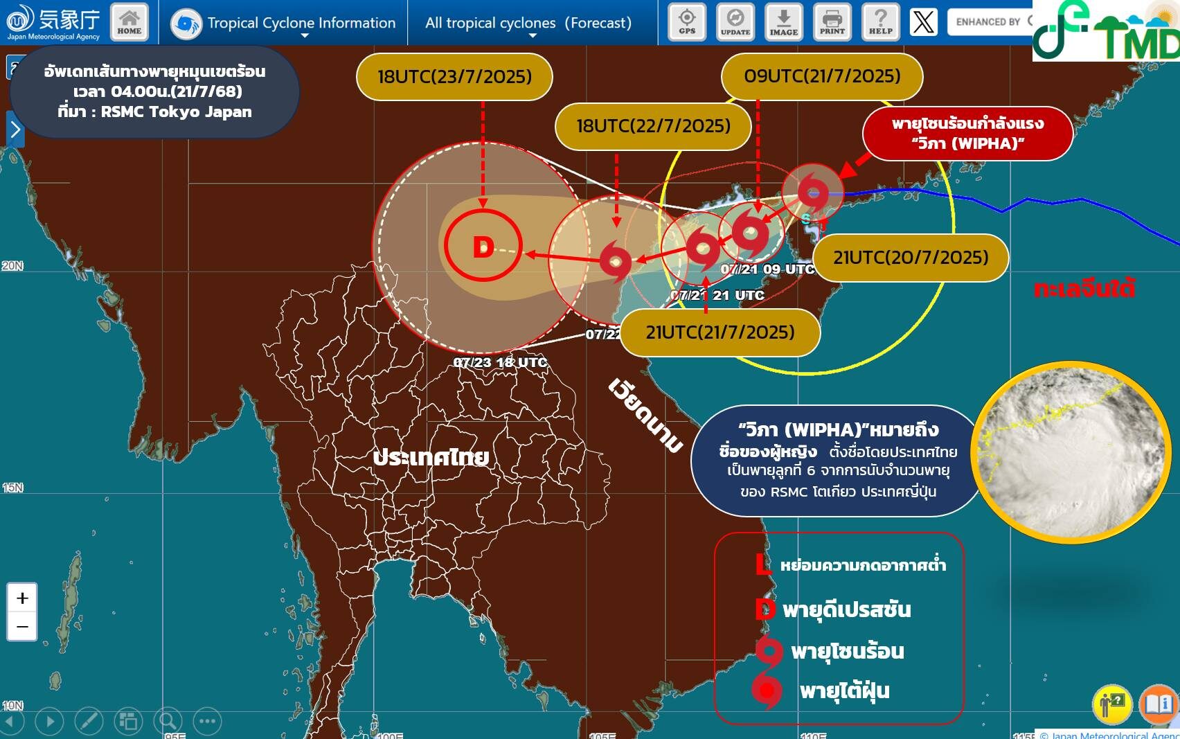 วันที่ 21 ก.ค.2568 กรมอุตุนิยมวิทยาอัพเดตสถานการณ์และเส้นทางพายุโซนร้อนกำลังแรง "วิภา(WIPHA)" เช้าวันนี้(21/7/68) : เช้าวันนี้มีศูนย์กลางอยู่บริเวณเมืองจ้านเจียง มณฑลกวางตุ้ง ประเทศจีน กำลังเคลื่อนตัวทางตะวันตก (พายุนี้เคลื่อนตัวเร็ว)
