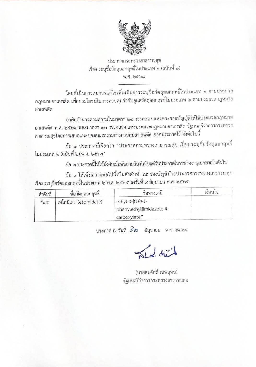 โดยระบุว่า วันที่ 15 กรกฎาคม 2568 ดร.ธนกฤต จิตรอารีย์รัตน์ ผู้ช่วยรัฐมนตรีว่าการกระทรวงสาธารณสุข เปิดเผยว่า รัฐมนตรีว่าการกระทรวงสาธารณสุข โดยการเสนอแนะของคณะกรรมการควบคุมยาเสพติด ได้ออกประกาศกระทรวงสาธารณสุข เรื่อง ระบุชื่อวัตถุออกฤทธิ์ในประเภท 2 (ฉบับที่ 2) พ.ศ. 2568 ลงวันที่ 12 มิถุนายน 2568 โดยประกาศให้สาร “Etomidate (เอโทมิเดต)” เป็นวัตถุออกฤทธิ์ ประเภท 2 ตามประมวลกฎหมายยาเสพติด