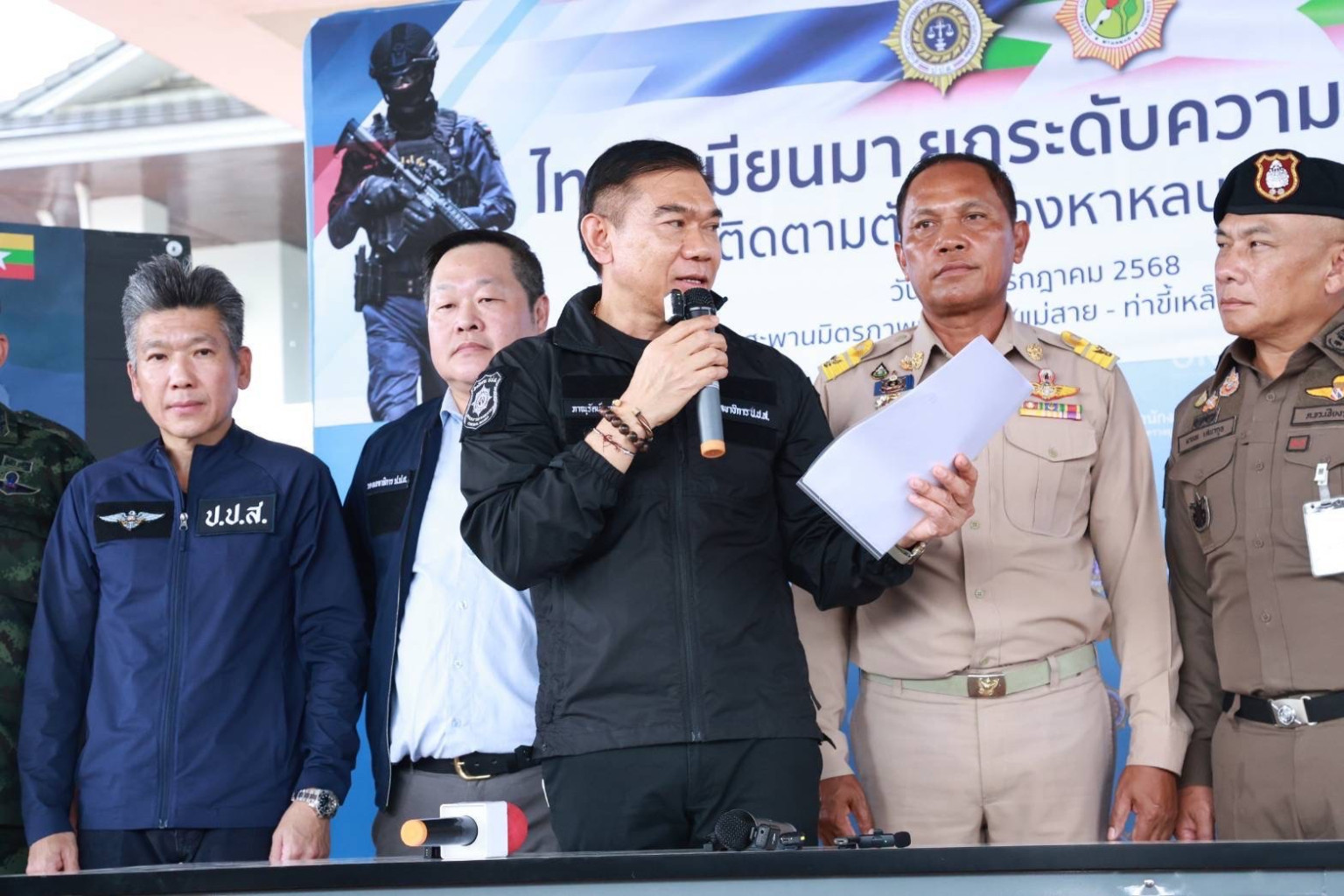 เวลา 15.00 น.วันที่ 16 ก.ค.68 ที่สะพานมิตรภาพแห่งที่ 2 (แม่สาย - ท่าขี้เหล็ก) จ.เชียงราย พล.ต.ท.ภาณุรัตน์ หลักบุญ เลขาธิการ ป.ป.ส. นายปฤณ เมฆานันท์ ผู้อำนวยการสำนักปราบปรามยาเสพติด สำนักงาน ป.ป.ส. นายธันวา ผุดผ่อง ผู้อำนวยการสำนักงานป้องกันและปราบปรามยาเสพติด ภาค 5 พล.ต.ต.มานพ เสนากูล ผู้บังคับการตำรวจภูธรจังหวัดเชียงราย พ.อ.ไพโรจน์ ยะวิญญชาญ ผู้แทนจาก นบ.ยส.35 พ.อ.ไมตรี ศรีสันเทียะ เสนาธิการ กองกำลังผาเมือง พ.อ.อนุวัช ปัญญานันท์ ผบ.ฉก.ทัพเจ้าตาก พ.ต.อ.สุรศักดิ์ เทียนทอง ผู้กำกับการตรวจคนเข้าเมืองจังหวัดเชียงราย นายอภิชาติ ใจงาม นายด่านศุลกากรแม่สาย พ.อ.ปริญญา วีระศรีนารา หัวหน้าศูนย์ข่าวยาเสพติด ฝ่ายข่าวศูนย์ปฏิบัติการกองทัพบก และคณะ นำกำลังชุดปฏิบัติการพิเศษ อินทรีย์ 19 ร่วมกันรับมอบตัว ผู้ต้องหาตามหมายจับ จำนวน 2 ราย คือ นายเตชินท์ และ นายฉมัง เป็นนักค้ายาเสพติดข้ามชาติรายสำคัญในระดับผู้สั่งการ หลังจากถูกออกหมายจับในคดียาเสพติด ได้ร่วมกันหลบหนีไปอาศัยอยู่ที่ จ.ท่าขี้เหล็ก เมียนมา จาก สำนักงานคณะกรรมการเพื่อการควบคุมยาเสพติด (Central Committee for Drug Abuse Control : CCDAC) สาธารณรัฐแห่งสหภาพเมียนมา นำโดย Police Brigadier General Thant Lwin Maung, Joint Secretary of the Central Committee for Drug Abuse Control Commander of Drug Enforcement Division