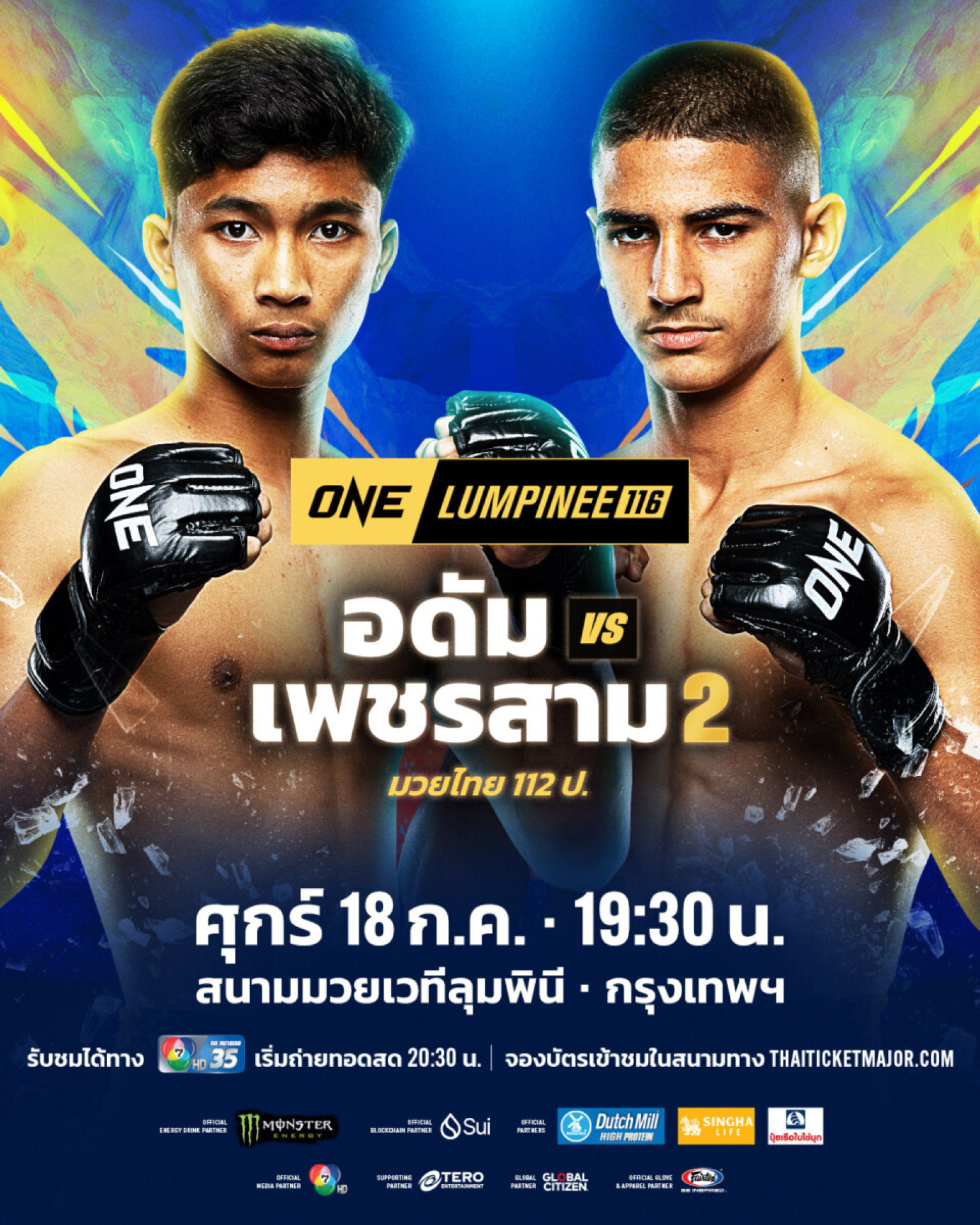 ติดตาม “อดัม vs เพชรสาม” ศึก ONE ลุมพินี 116 ถ่ายทอดสดจากสนามมวยเวทีลุมพินี (รามอินทรา) วันศุกร์ที่ 18 ก.ค.นี้ แฟนกีฬาการต่อสู้ชาวไทยสามารถจองบัตรเข้าชมในสนามผ่านทาง THAI TICKET MAJOR คู่แรกเริ่มเวลา 19.30 น. และรับชมทางช่องทางต่าง ๆ ดังนี้